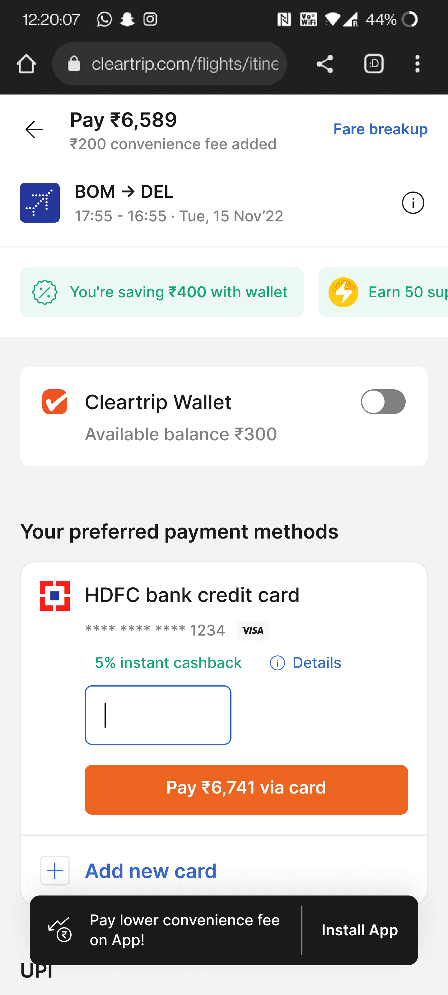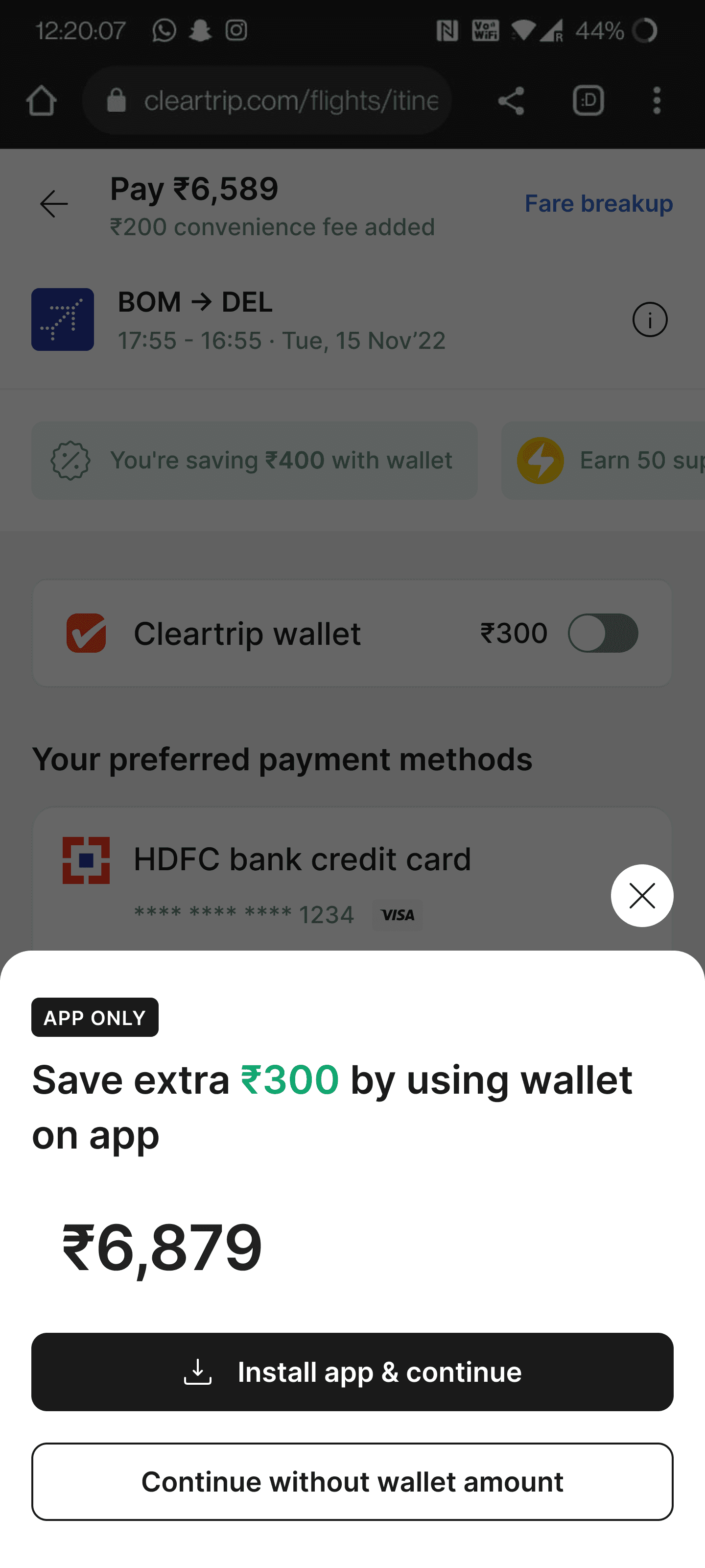 For logged-in users, promo wallet toggles open options to install the app or proceed without a discount, with the "Install App" CTA applying wallet values automatically on the payment page,