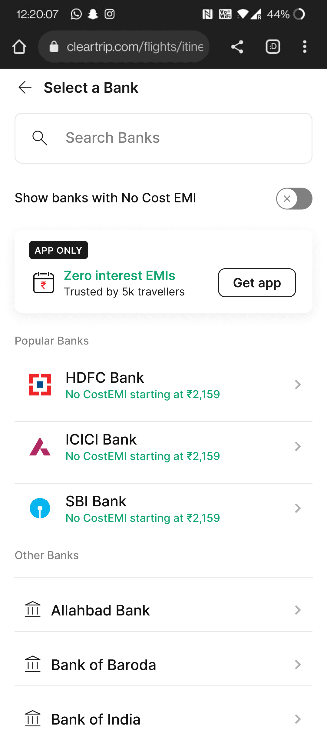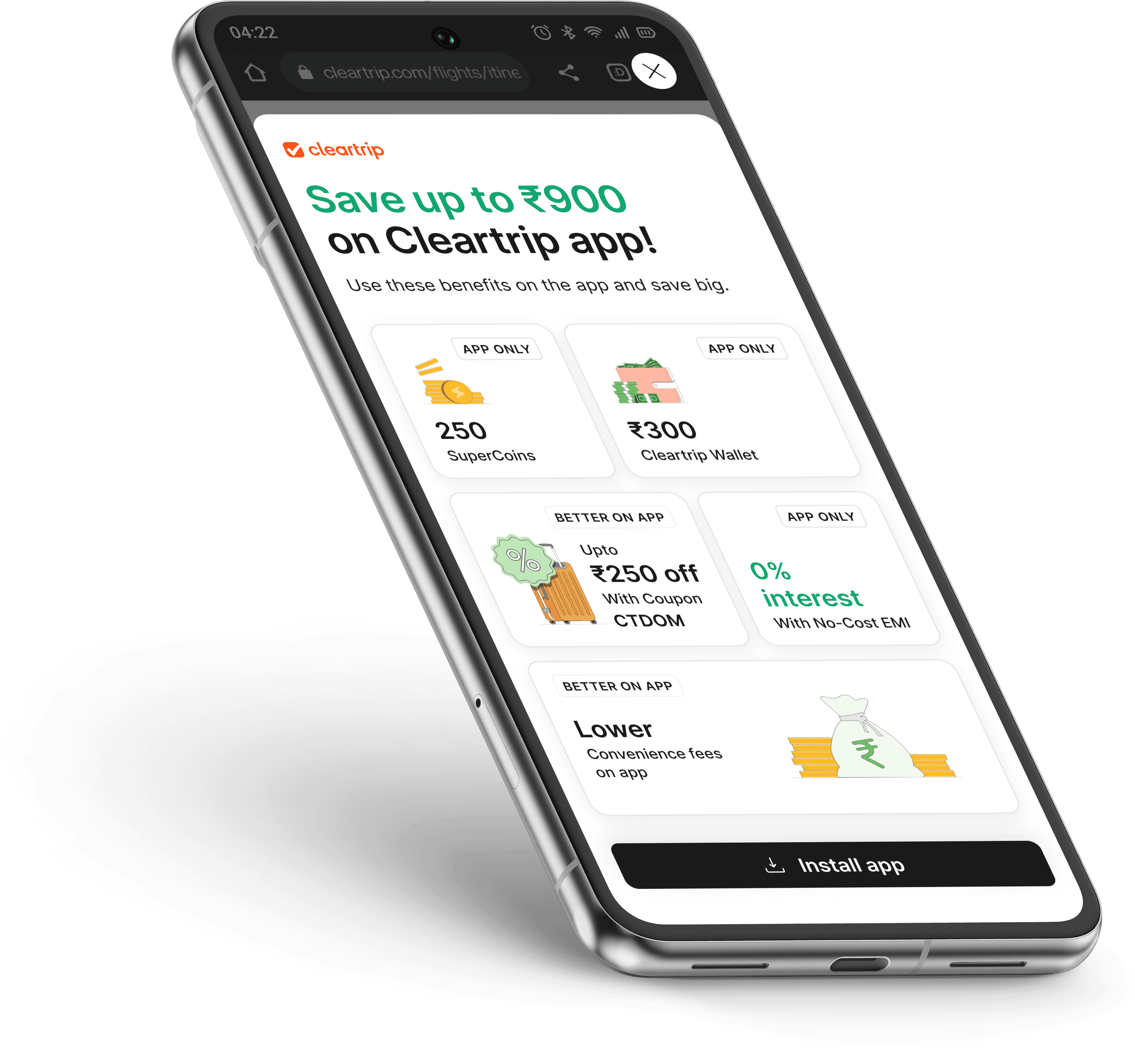 Display the lowest no-cost EMI option for all users, with an "Install App" CTA that redirects to the app store and then to the itinerary page. This applies to users with or without saved payment methods.
